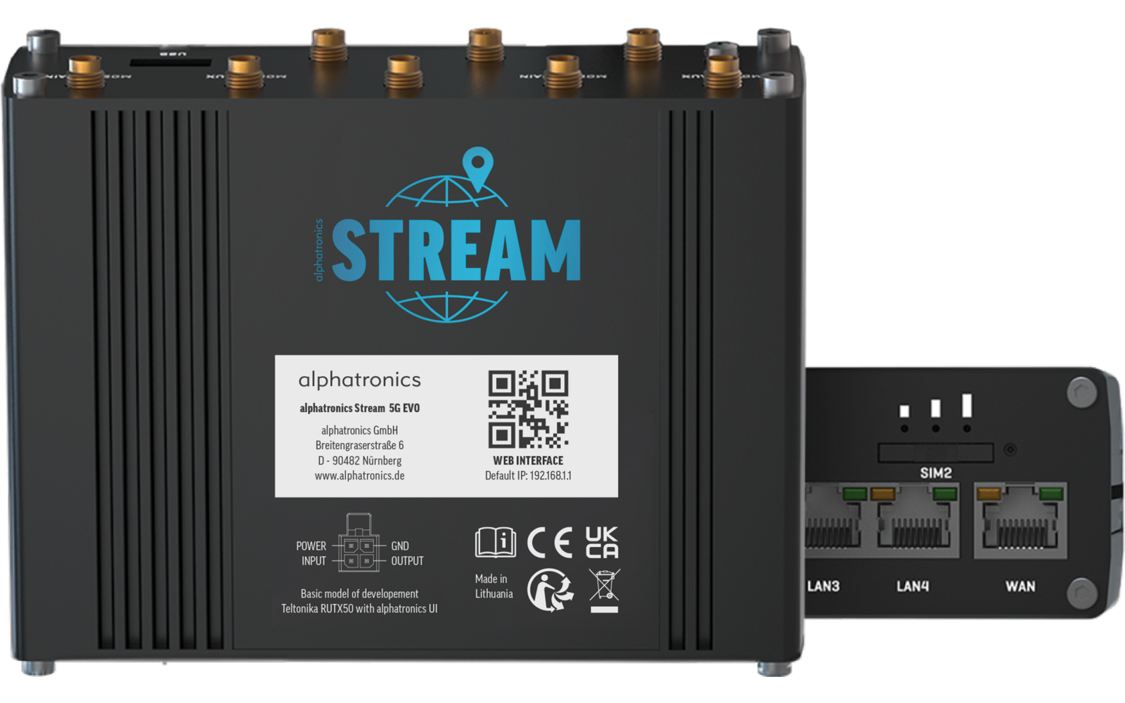 - Anschlüsse Router: 4x SMA für LTE, 2x RP-SMA für WLAN, 1x SMA für GPS, 4x RJ45, 1x USB-A, 1x 4-Pin Stromanschluss DC, 2x SIM-Slot