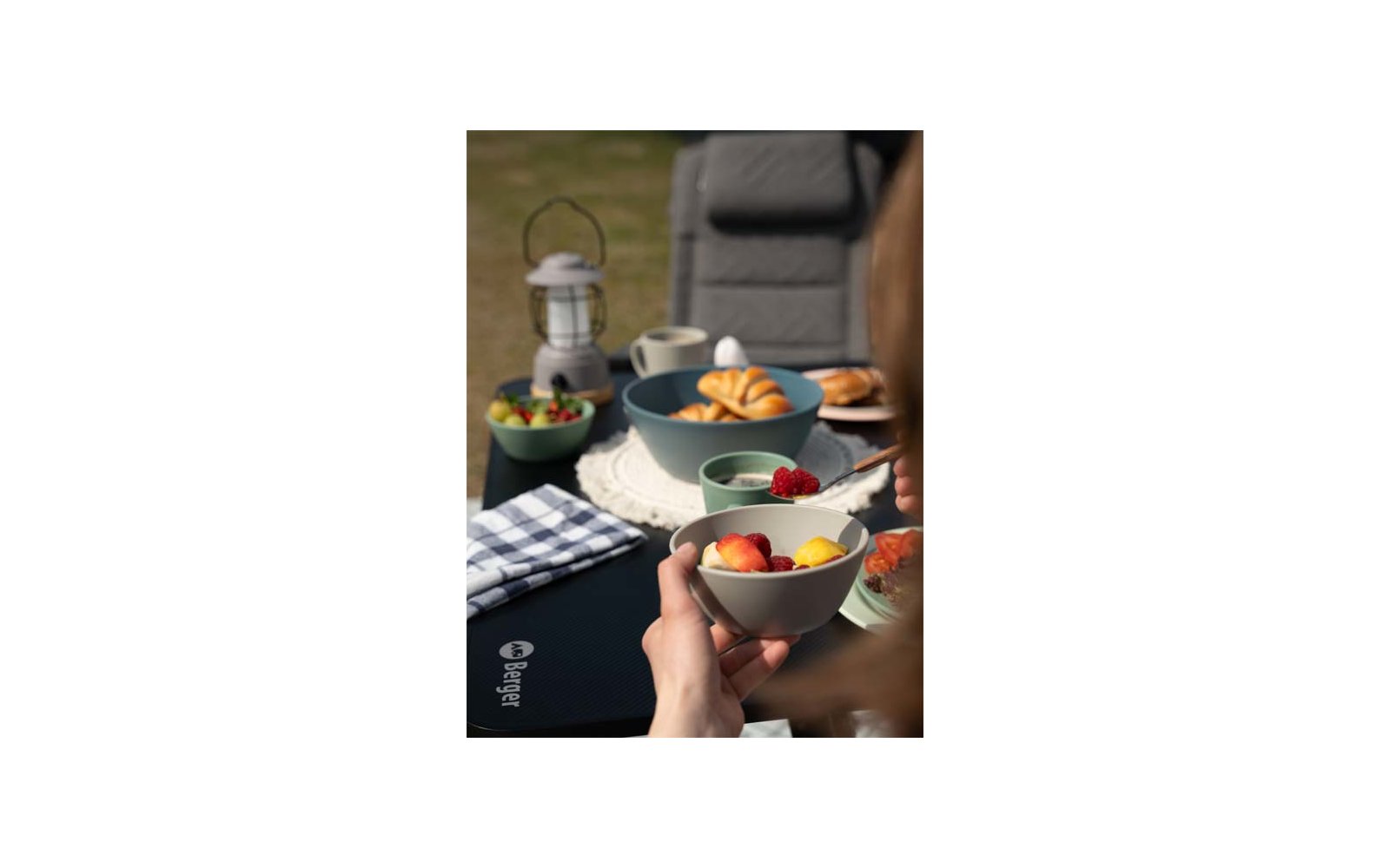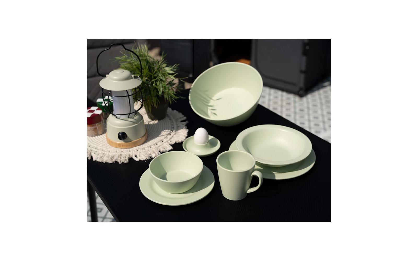 "Wir haben uns ein buntes Set um die Schalen herum zusammengestellt, bestehend aus Tellern, Bechern, Schüsseln, Tassen, Salatschüsseln und Eierbechern. Die Farben sind toll aufeinander abgestimmt, das Material sehr robust und bruchfest. Ein echter Hingucker auf dem Campingplatz. "