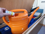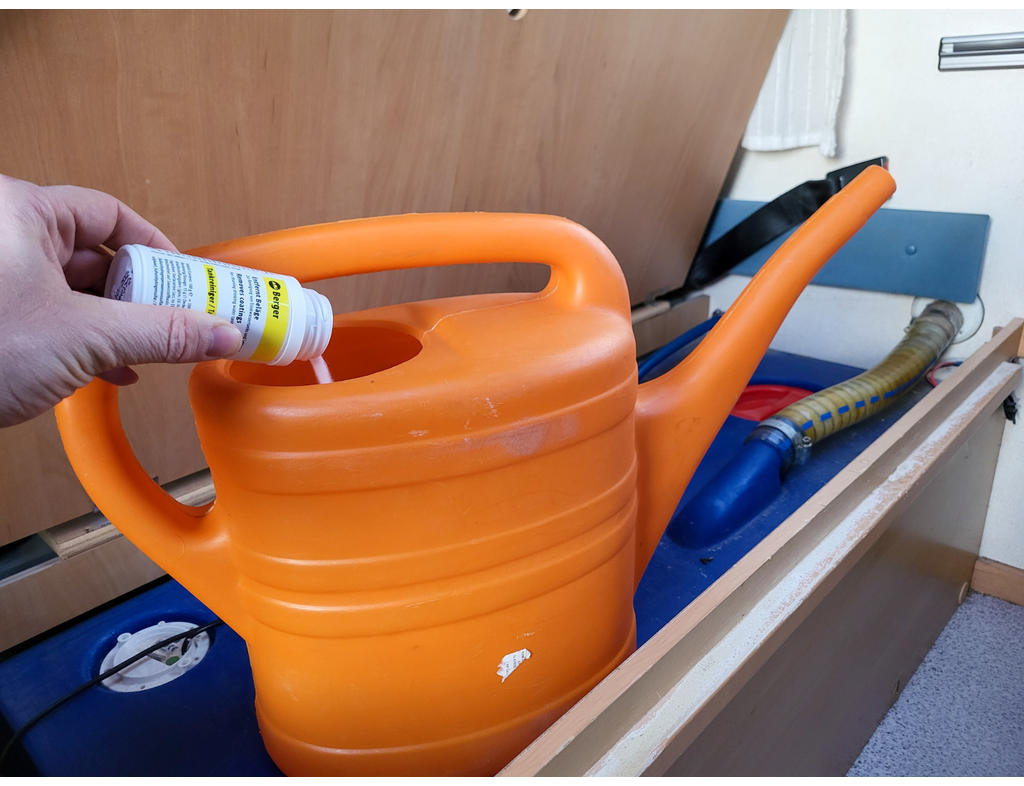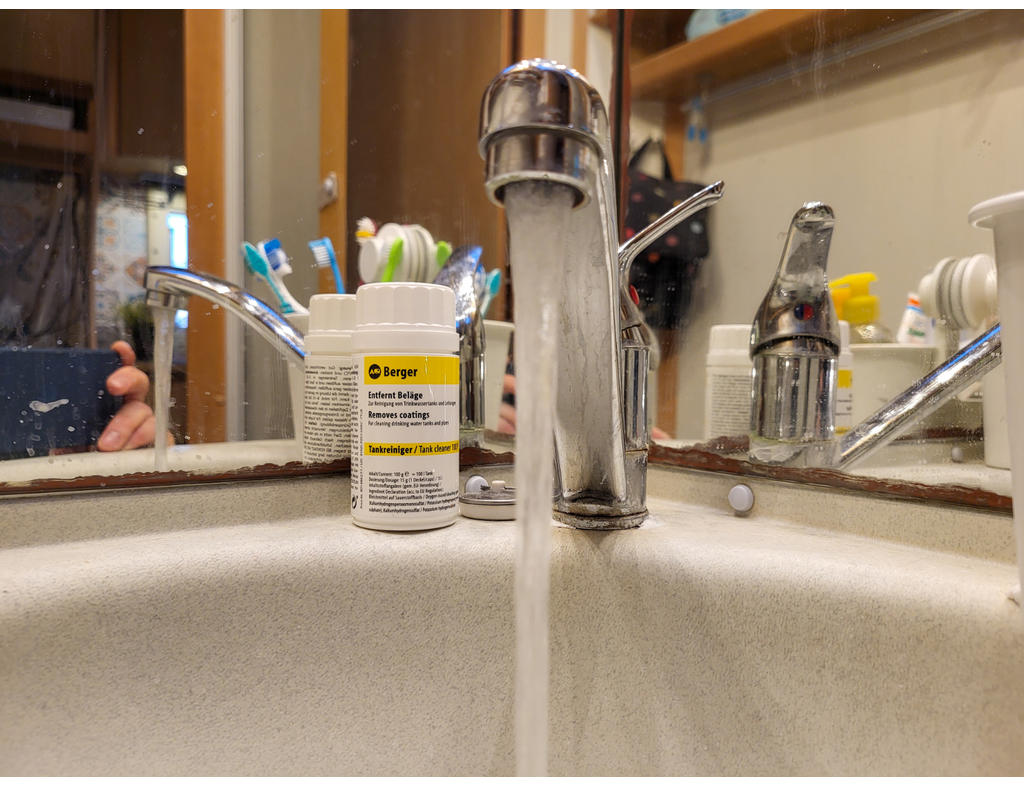 „Wir haben sehr kalkhaltiges Wasser zuhause. Die Anwendung ist sehr ähnlich wie beim Tankreiniger. Man löst den Entkalker in 10 Liter Wasser auf (auch hier nutzen wir eine Gießkanne) und dann in den leeren Tank gefüllt. Dieser wird mit Wasser aufgefüllt und dann muss das Mittel einwirken. Danach muss das komplette System mit frischem Wasser gespült werden. Alle Rückstände von Kalk werden entfernt.“