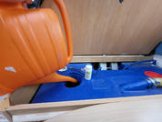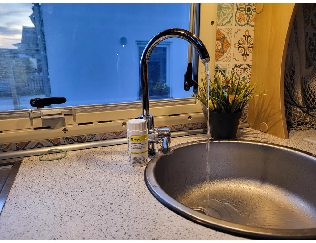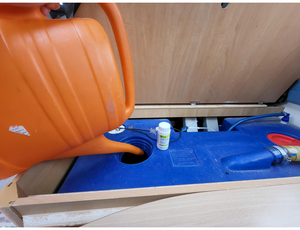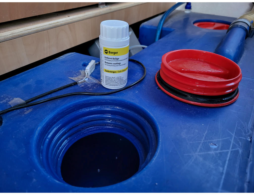 „Der Tankreiniger ist in der gelben Flasche und wird als erstes angewendet. Es handelt sich um 100g Pulver, welches in 10 Liter warmem Wasser auflöst wird. Der Tankreiniger hat eine neutrale Farbe. Das Wasser wird leicht trüb. Das Pulver ist geruchsneutral. Die daraus entstandene Lösung wird dann in den leeren Frischwassertank gefüllt. Weiter Schritte folgen: - Tank auffüllen - Wasserhähne kurz öffnen (nicht die WC Spülung vergessen) - Einwirken lassen – am besten über Nacht - Tank in Abwassertank leer laufen lassen Der letzte Schritt ist praktisch, da dabei gleich auch der Abwassertank gereinigt wird. Wir haben das Wasser dort auch noch eine Zeit wirken lassen, bevor wir es abgelassen haben. Hier sollte man auch bedenken, dass der Abwassertank evtl. nicht das gleiche Fassungsvolumen hat, wie der Frischwassertank. Die Anwendung war einfach. Hier muss man natürlich bedanken, dass die Möglichkeit der Ver- und Entsorgung besteht.“