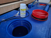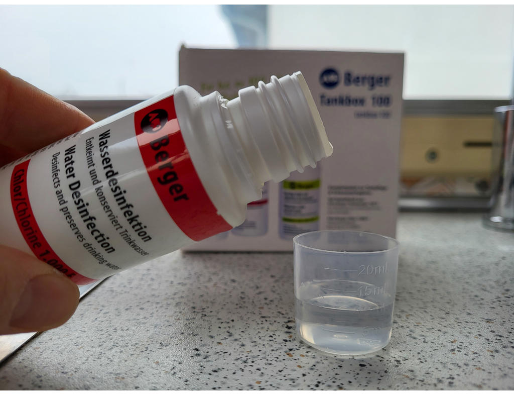 „Das Fläschchen mit den Chlor reicht für viele Anwendungen. Zur Dosierung ist eine kleine Dosierkappe auf der Flasche aufgesteckt. Es riecht nach Chlor. Wir benutzen das Chlormittel nur bei fragwürdigen Wasserquellen.“