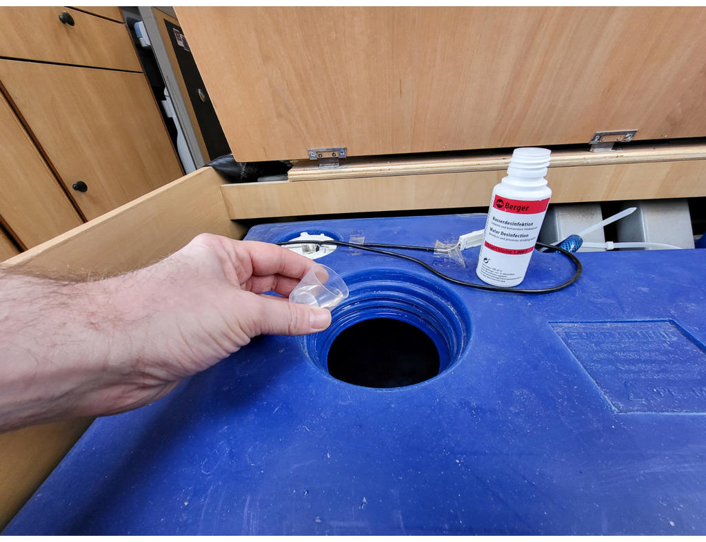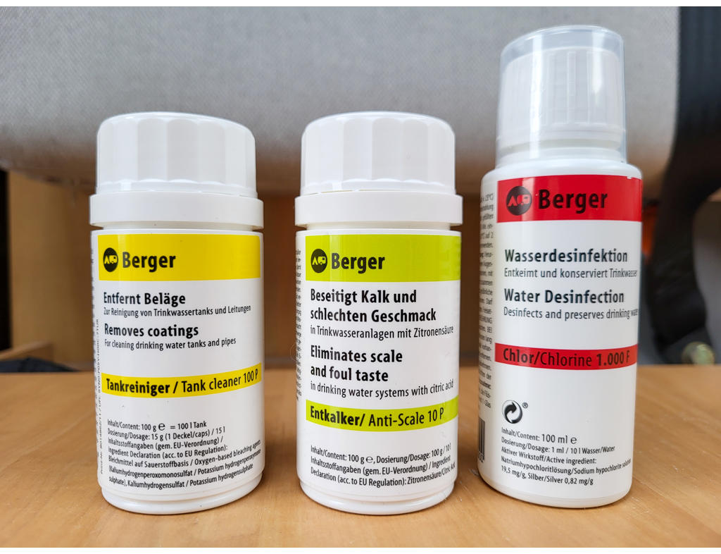 „Unser Frischwassertank umfasst 100 Liter. Also passgenau für das „Berger Tankbox 100 Set“ (Tankreiniger, Wasserdesinfektion & Entkalker)“