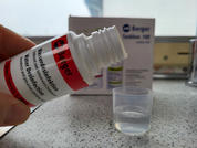 Hand hält eine kleine Plastikflasche mit Flüssigkeit