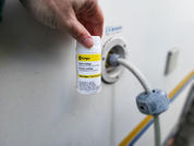 Hand hält ein offenes Medikamentenfläschchen über ein Becherglas in der Nähe eines Spülbeckens