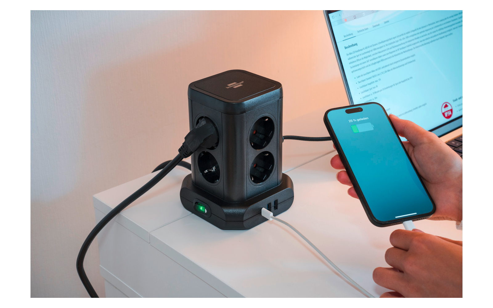 | 8 Schutzkontakt-Steckdosen im Turmdesign | 2x USB A bis 18 W | 1x USB C bis 20 W Power Delivery | Rutschfeste Unterseite und erhöhter Berührungsschutz |