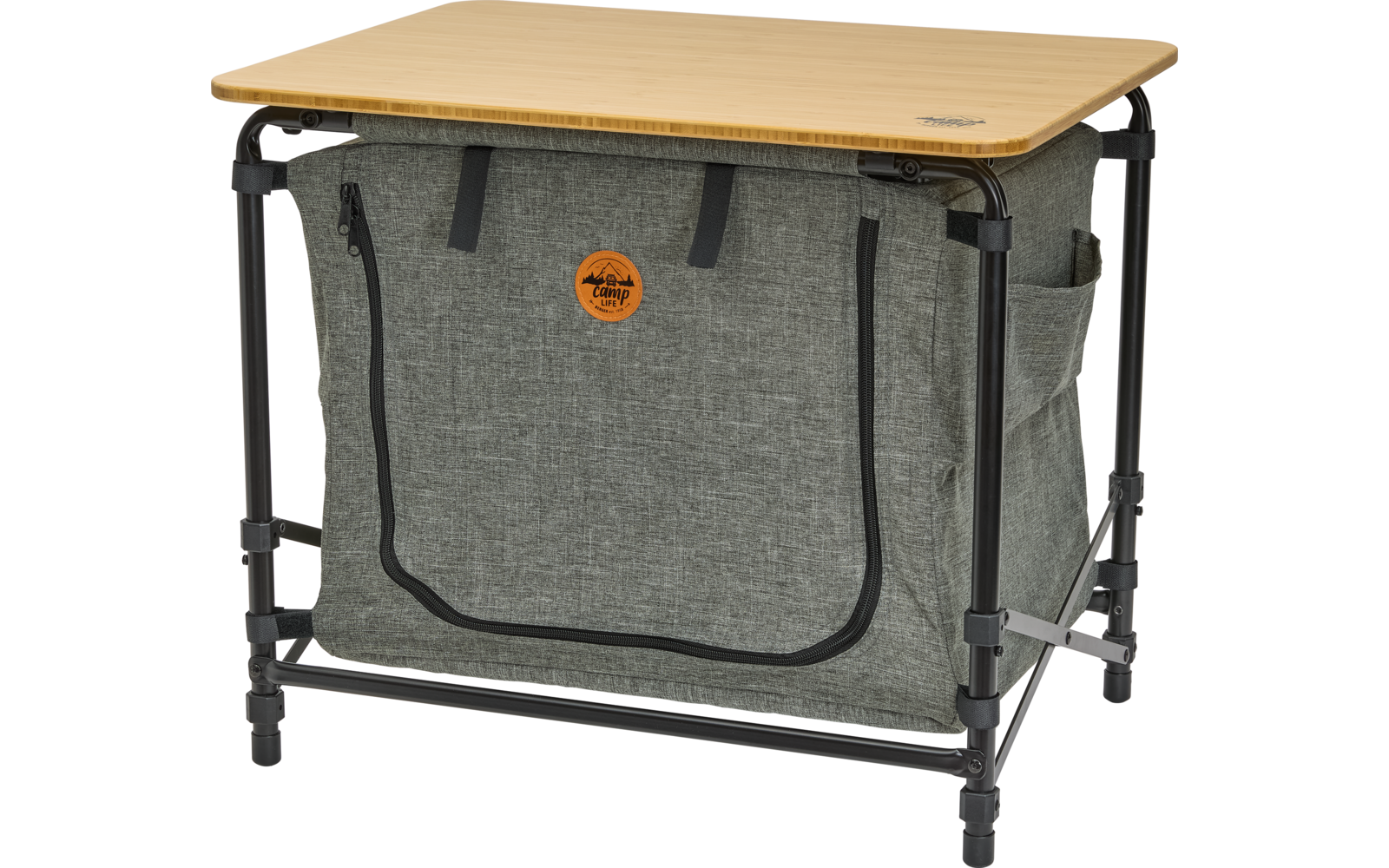 Diese stilvolle Küchenbox überzeugt durch hochwertige Materialien und ein durchdachtes Design. Der strapazierfähige Stoff in elegantem Grau verleiht dem Produkt eine moderne Optik und fügt sich harmonisch in jede Umgebung ein. Die Arbeitsplatte aus nachhaltigem Bambus bietet eine natürliche, robuste Oberfläche und ist ideal für den Einsatz beim Camping oder auf der Terrasse.