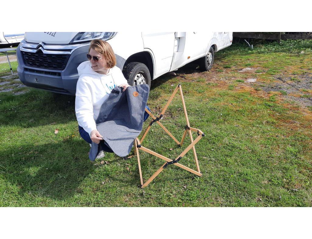 „Der Campingstuhl ist sehr chic und modern. Das Design entspricht genau unserem Geschmack. Die Bambusoptik ist ohnehin gerade total Trend und macht den Stuhl so zu einem modernen und zeitgemäßen Begleiter. Der Bezug ist grau und mit einem kleinen Lederschildchen versehen. Macht ihn irgendwie ein bisschen zu einem Designerstück unter den Campern.“