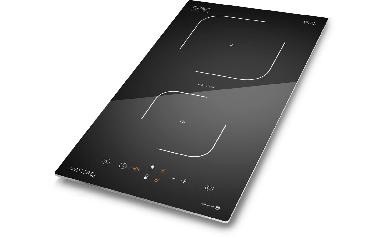 Mit dem Doppelinduktionskochfeld Master E2 von Caso kochst du effizient auf zwei Kochzonen mit insgesamt 3500 W Leistung, aufgeteilt in 1500 W und 2000 W. Du steuerst beide Kochfelder individuell mit Sensor-Touch, stellst jeweils 9 Leistungsstufen und einen Timer von 1 bis 99 min im 1 min Intervall ein und behältst dank großer Digitalanzeige alles im Blick. Die hochwertige Ganzglas Schott Ceran® Oberfläche aus umweltfreundlichem Ceran Suprema® sorgt für einfache Reinigung. Für Sicherheit sorgen automatische Topferkennung, Überhitzungsschutz, Tastensperre und automatische Abschaltung bei Nichtgebrauch.
