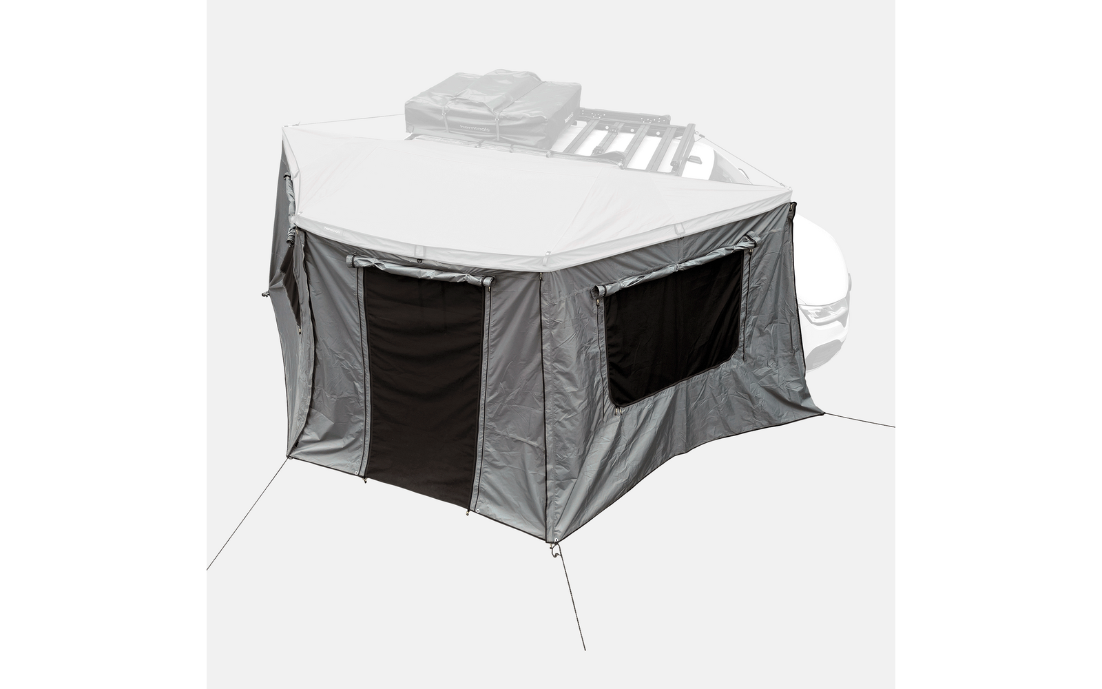 Der Aufbau gelingt in wenigen Minuten über ein praktisches Reißverschlusssystem. Nummerierte Elemente erleichtern dir die Montage, und die Wände lassen sich auch einzeln als Windschutz nutzen. Fenster mit Moskitonetzen sorgen für zusätzlichen Komfort. Die in der Markise integrierte, dimmbare Beleuchtung ergänzt dein Setup mit angenehmem Licht.