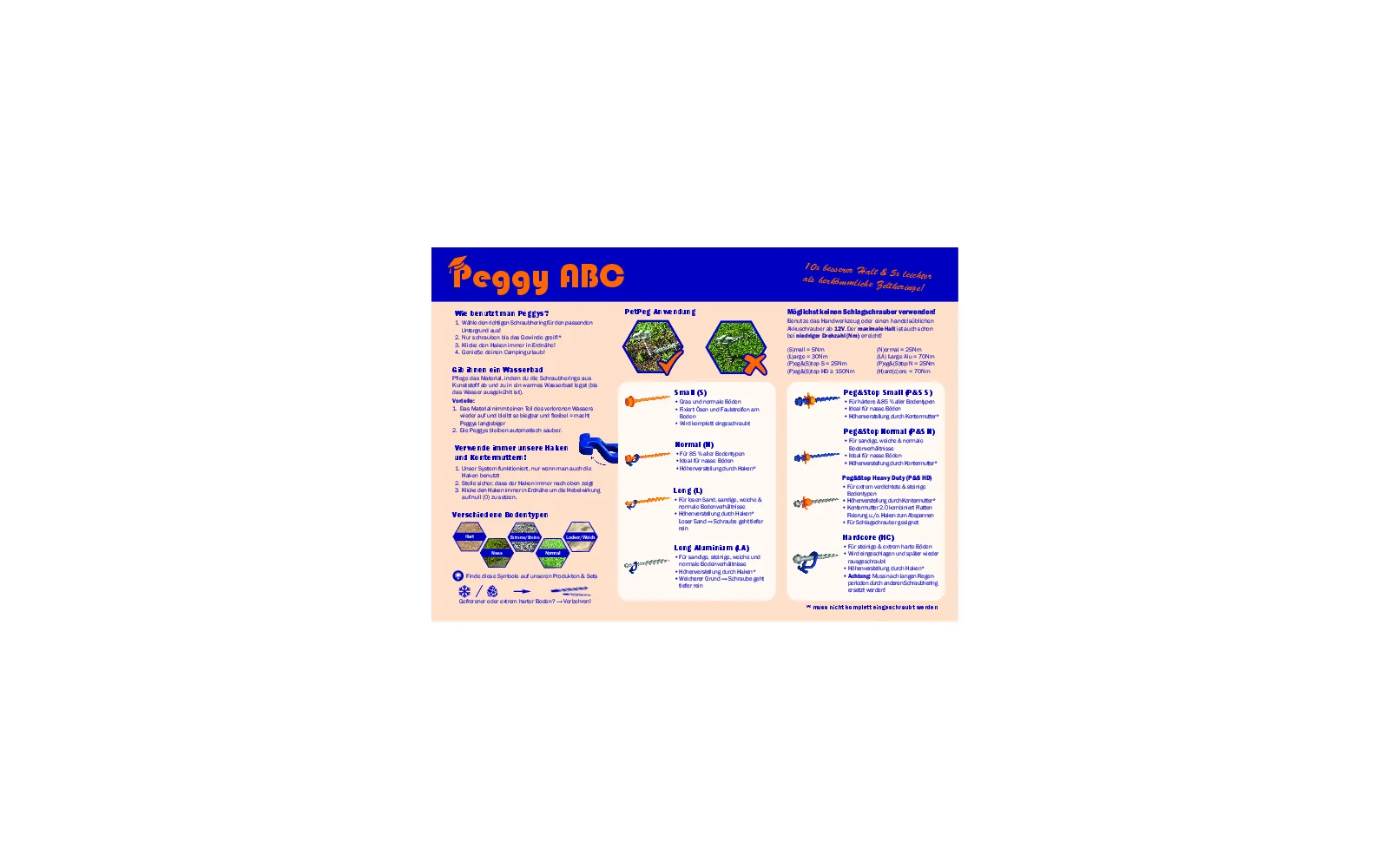 Die Peggy Peg Kunststoff-Schraubheringe werden aus glasfaserverstärktem, UV-beständigem Polyamid hergestellt. Dadurch sind die eingesetzten Heringe leicht zu erkennen und reduzieren die Unfallgefahr.