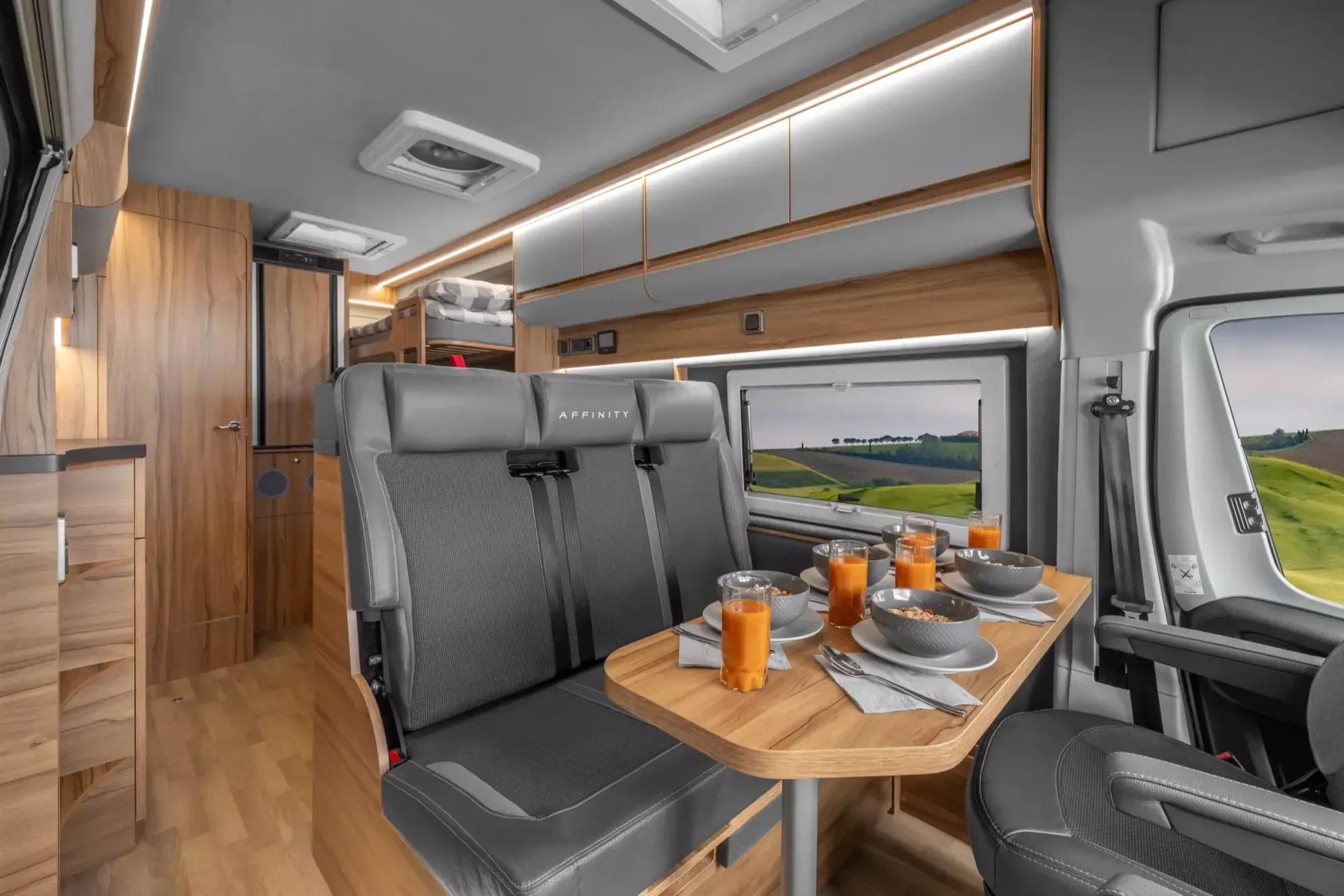 Der Affinity Five auf Basis eines Fiat Ducatos mit einer Länge von 6,36 Meter ist eines der wenigen Fahrzeuge, die für eine fünfköpfige Familie geeignet sind. Trotz seiner kleinen Grundfläche ermöglicht die funktionale Aufteilung des Campingbusses ein komfortables Reisen für zwei Erwachsene und drei Kinder. Das Platzangebot ist vergleichbar mit dem von größeren Wohnmobilen oder Wohnwagen.
