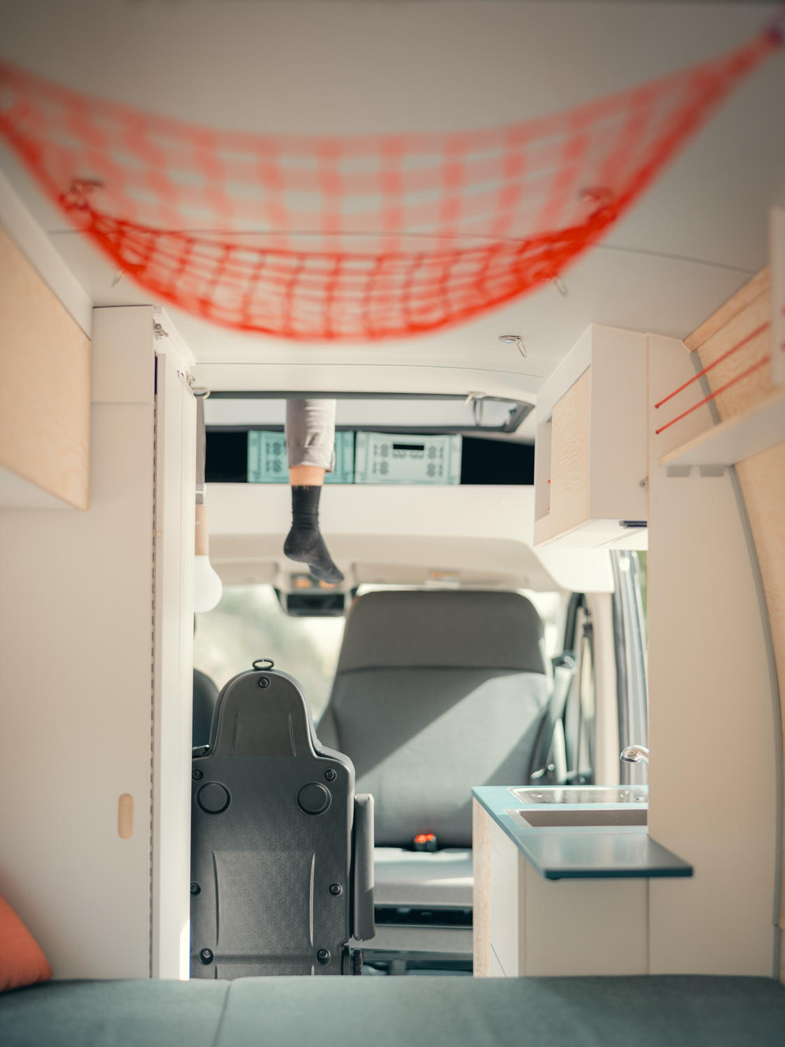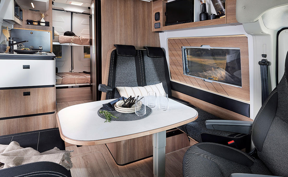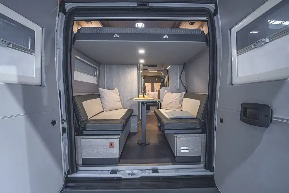 Er verfügt über fünf vollwertige Sitzplätze, die sich ohne Umbau vom Reisemodus in den Wohnmodus nutzen lassen, und bietet Schlafplätze für bis zu fünf Personen, verteilt auf ein Heck-Querbett und ein Schlafdach. Die Sitze sind flexibel verstellbar, verschiebbar und herausnehmbar, sodass sich die Lounge- und Essbereiche individuell konfigurieren lassen und auch Isofix-Befestigungen für Kindersitze möglich sind.