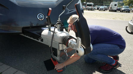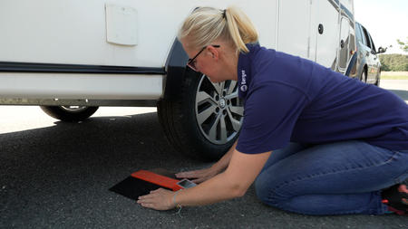 Platziere die Waage circa 10 Zentimeter hinter dem Reifen. Ich empfehle dir, die Waage im Rückwärtsgang zu überfahren, so wird das Messergebnis genauer.